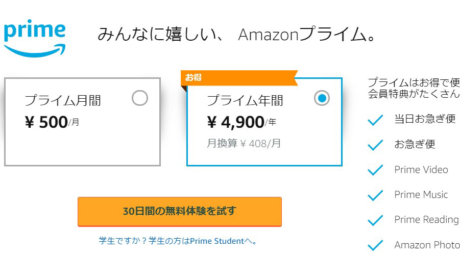 Amazonプライムの年会費が、3900円から4900円に値上がり。月会費やPrime Studentも同様。