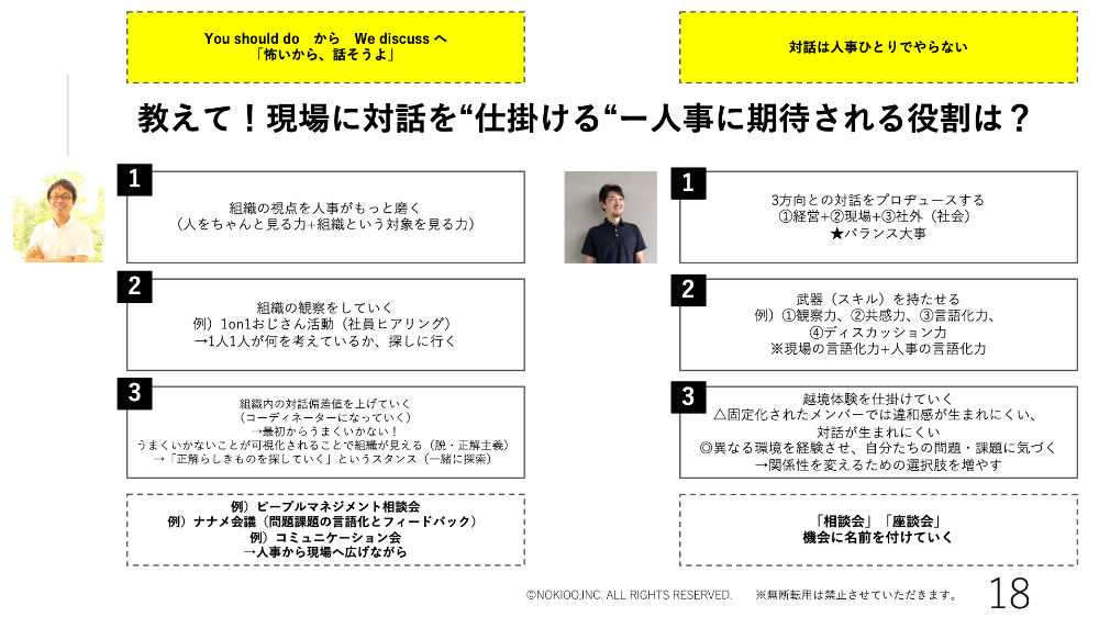 「対話」は人事1人でがんばろうとしない小田木朝子氏(以下、小田木):最後の3つ目のテーマまでいきたいので、次に進んでもよろしいですか?沢渡あまね氏(以下、沢渡):そうですね。やはり時間がなくなってきた。小田木:まだいくらでも話せると思うんで...