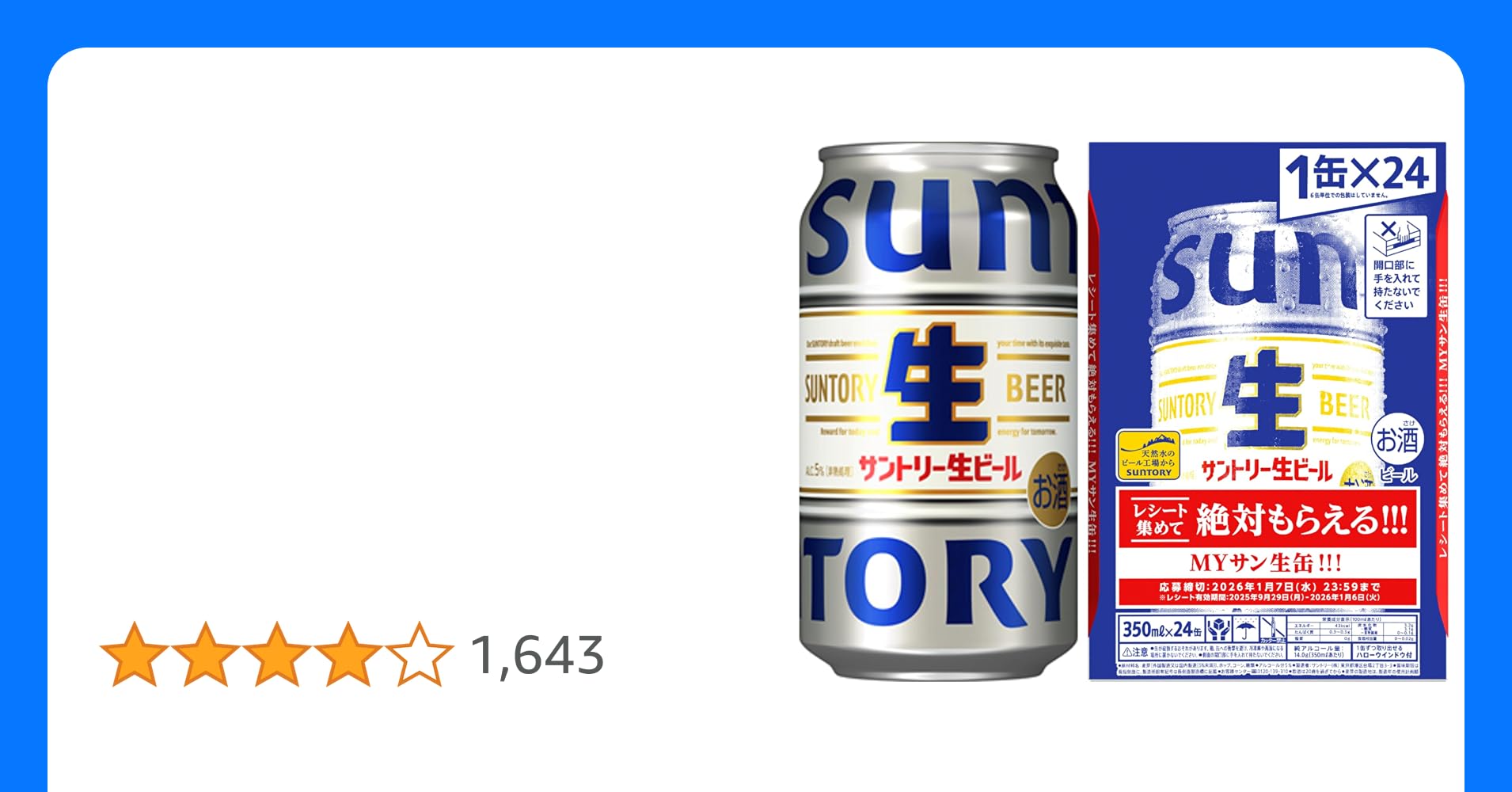 サントリー生ビール 350ml 24本 【絶対もらえるMYサン生缶キャンペーン】 [6缶包材なし] [サントリー ビール] 1ケース